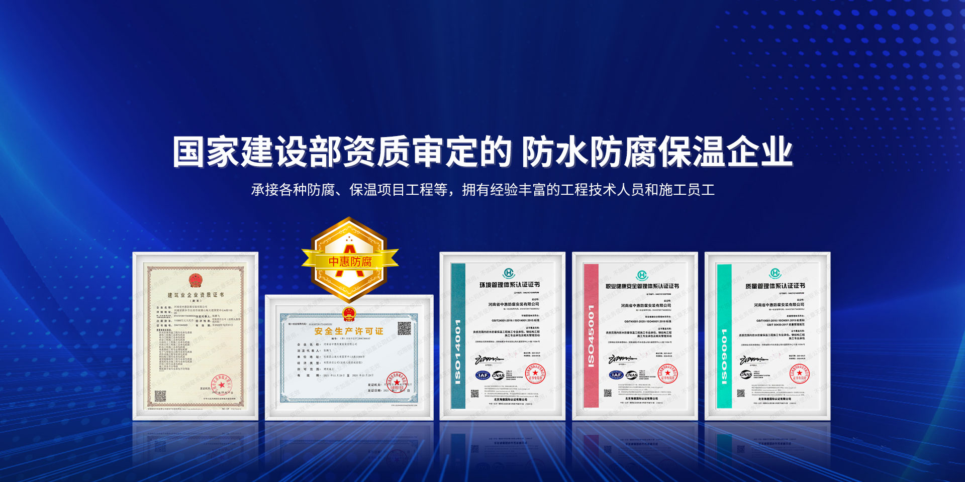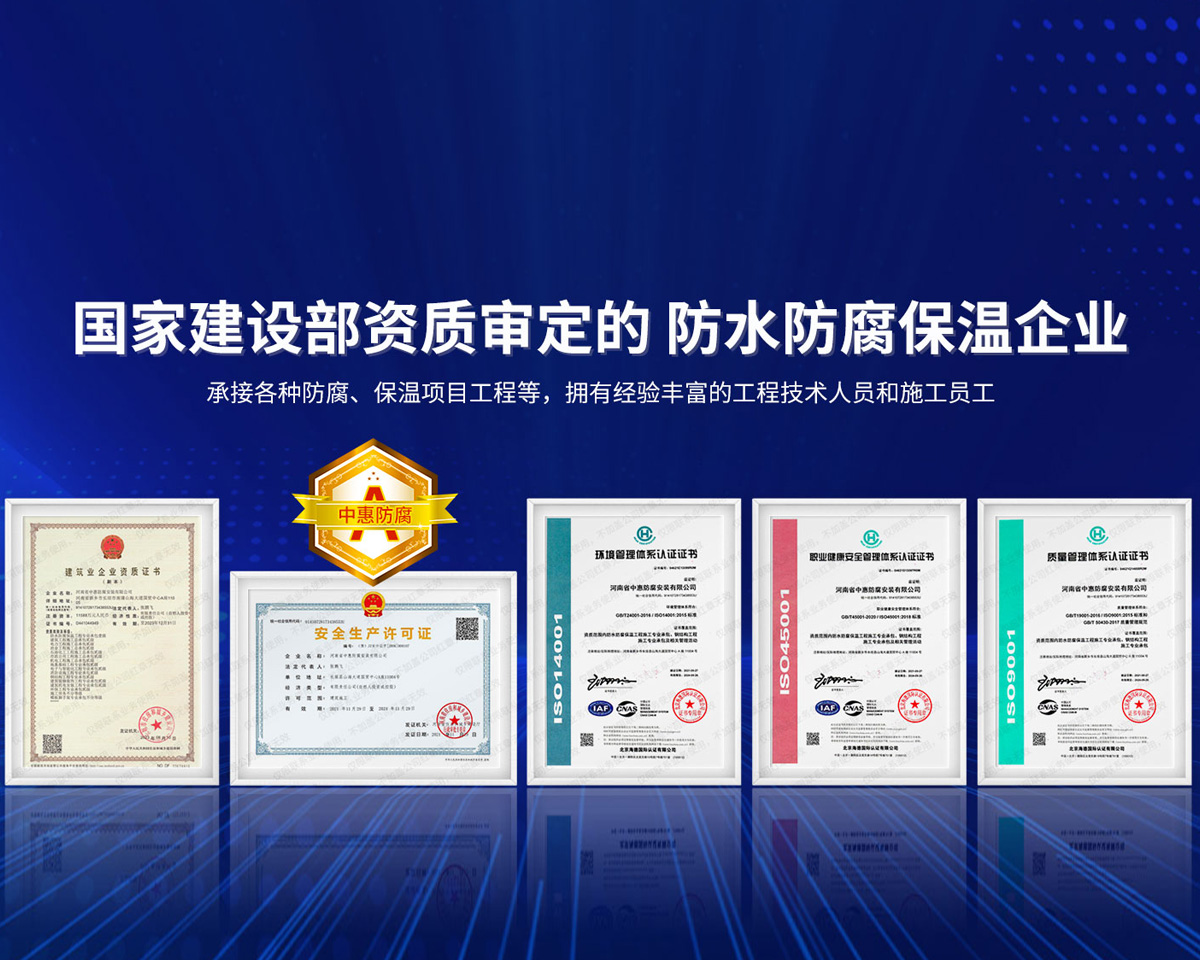 公司經營范圍:防水防腐保溫工程;消防設施工程;建筑裝修裝飾工程;建筑機電安裝工程;電力工程;建筑工程;石油化工工程;工業清洗工程;油罐清洗工程;鋼結構工程;環保工程;模板腳手架工程;電纜防火封堵、防污閃噴涂、外墻外保溫工程;各類施工勞務作業;設備維修、船舶鉚焊、涂裝;電力工程材料、建材、防水材料、防火材料、防腐保溫材料銷售,并相繼通過了GB/T19001-2008idtISO9001:2008GB/T50430-2007質量管理體系認證證書。GB/T24001-2004idtISO14001:2004環境管理體系認證證書。GB/T28001-2011idtOHSAS18001:2007職業健康安全管理體系認證證書。公司是中國防腐蝕于防護協會、中國施工企業管理協會、電力協會和中國鋼結構防水協會會員單位。 公司的經營業務涵蓋了石油、化工、電力、冶金、煤炭、船舶、國防、燃氣、水利、環保、交通運輸、航空及國防軍工和輕紡市政等行業的防腐保溫絕熱設備。鋼結構安裝、防火、防水、金屬噴鍍、聚脲噴繪、陰極保護、防滲透堵漏、玻璃鋼及各種磚版材料襯里、橡膠襯里、煙氣硫和耐酸溶劑腐蝕等工程施工。公司連續十年榮獲“省市先進施工企業”“安全生產先進單位”“重合同,守信用企業”和“AA***資質企業”的稱號。2000年被命名為市級文明單位,2002年被國家工商行政管理局命名為“重合同,守信用的企業”、被中國工業防腐蝕技術協會命名為“防腐蝕企業,能源節約及環境保護領域有豐富的經驗和***的業績。工程一次交驗合格率100%。其中攀枝花鋼鐵公司煉鐵廠四號高爐及熱風爐防腐工程、上海寶鋼公司煤氣柜防腐工程、撫順石油一廠裝置防腐項目、齊魯石化公司稀烴廠高塔防腐工程、吉林化學工業公司煉油廠油罐防腐工程、天津石化熱電廠六號爐頂棚聯絡管保溫工程、大慶油田(太倉)力神泵業工程、中國化學工程第十一建設工程、中原油田勘探局工程、中國石化銷售有限公司華北分部、魯皖輸油管道工程、貴州開磷息烽合成氨工程、陜西黃陵煤化工程、中國石油天然氣西部管道塔里木輸油工程、邯鋼集團邯寶鋼鐵公司煉鐵工程、德州供電工程、吉寶(南通)船廠工程,偃師華潤熱力工程、鄭州熱力總公司。 河南省中惠防腐安裝有限公司愿以豐富的施工經驗,***的技術,***的設備,***的管理,***的服務,竭誠為國內外廣大的用戶提供***滿意、******的工程作品。 我公司愿與國內外同仁一道,團結協作,共同推進防腐蝕行業發展! 公司地址:河南省長垣縣建設路北段360號 固定電話:0373-8866488 郵編:453400 網址:http://www_zhff_com_cn.hzjzsw.com